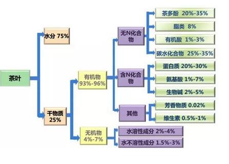 由圖可見,茶葉中含水分75%,這也就是“4斤葉1斤茶”的科學(xué)依據(jù)。而茶葉中的水溶性物質(zhì)為30%-48%,其主要化學(xué)成分包括茶多酚類、生物堿類、氨基酸類、糖類、有機酸等,它們構(gòu)成了茶葉的品質(zhì)和滋味。